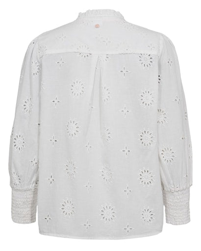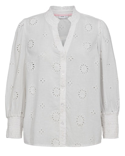 The Numph Nusammy shirt is made from a light cotton fabric. It features delicate lace embroidery details, ruffle collar and ruched cuffs. It has a button down fastening on the front and flattering V-neck. It's a classic white shirt with a modern twist that can be dressed up or down.